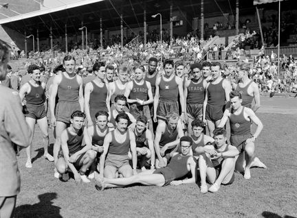 Stadion. Grupporträtt på deltagare vid Svenska Dagbladets stafettlopp