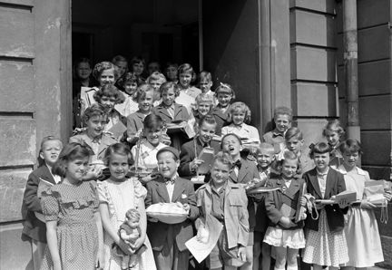 Nicolai Skola. Skolavslutning. Skolbarn i trappan till porten