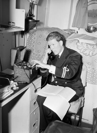 Fartyget Superb. En förbindelseofficer sköter telefonväxeln i en hytt ombord