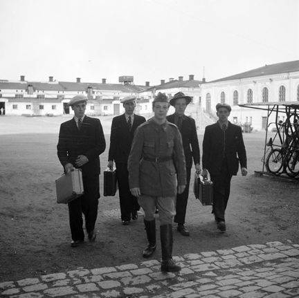 Svea Artilleriregemente. Inryckning. Fyra unga män i civila kläder går bakom en man i uniform