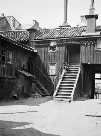 Gårdssidan vid Styrmansgatan 14. Elkablar fästa i väggen hänger över gården. I trappan står en krukväxt