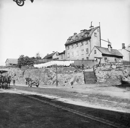 Hantverkargatan 26 (nu 54) västerut från hörnet av Polhemsgatan. Trapporna leder till Bergsgränd 3 (nu Polhemsgatan 21). En stor mängd tvätt hänger ute på tork.
