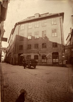 Exteriör av Stockholms Pantbank vid Brända Tomten, runt sekelskiftet 1900.