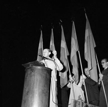 Jarl Hjalmarson, Högerpartiets partiledare, talar på högermöte utanför Råsundastadion