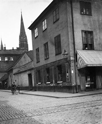 Kammakargatan österut från Stora Bastugatan (nu Sveavägen) med Johannes kyrka i fonden. T.h. Kammakargatan 11, kv. Moraset. En pojke cyklar