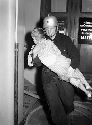 Mäster Samuelsgatan 46. Brandman bär ut 7-åriga Karl Gustav Harald. Eldsvåda uppstod i huset efter att en brottsling, en dynamitard, försökt spränga ett kassaskåp i ett försäljningskontor.