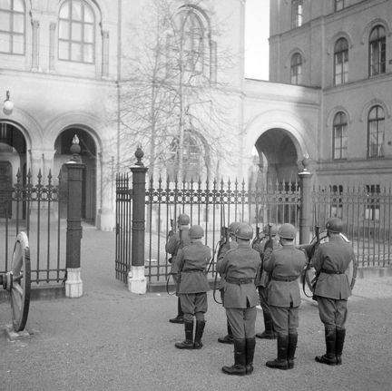 Svea Artilleriregemente. Parad vid flaggans halande, soldater skyldrar gevär