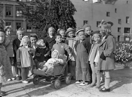 Grupporträtt av en samling barn vars mammor vid tillfället ägnar sig åt husmodersgymnastik. Här passas de av barnträdgårdslärarinnan Margot Fränckels