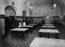 Restaurang Shanghai. Interiör, tredjeklassmatsal med gäster och serveringsdisk.