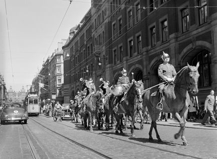 Kungliga Livgardesskvadronens (K1) musikkår till häst blåser in Nationaldagen. De rider söder ut på Vasagatan.