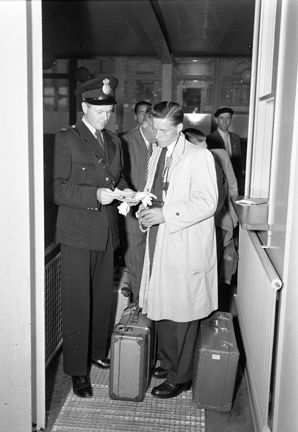 Skeppsbron. Passkontroll. Konstapel Ulf Söderström vid passpolisen låter gymnastikläraren Ulf Almgren passera med ett legitimitetskort. Den stora nordiska passfriheten började gälla idag, 12/7 1952