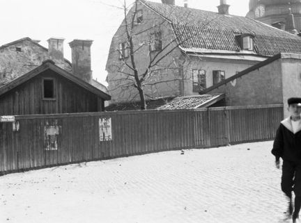 Pojken befinner sig i hörnet av Svartensgatan och Fiskargatan. Katarina kyrka anas t.h. Dåv. kv. Häckelfjäll, nuv. kv. Kungen