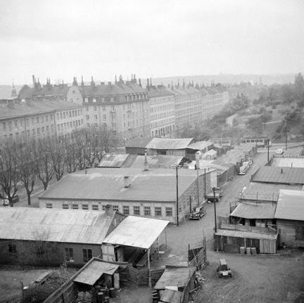 På bilden syns Brännkyrkagatan till vänster och i fonden Varvsgatan med spårvagnen.