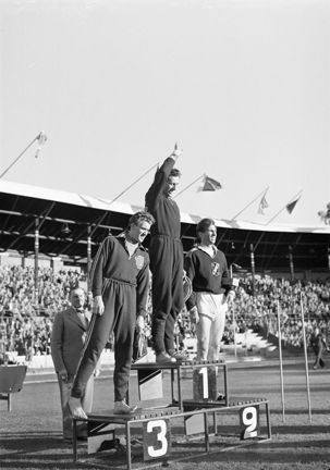 Stadion. SM i friidrott. Prisutdelning. Tre män på prispallen