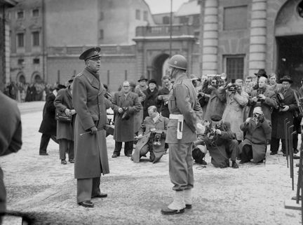 Yttre Borggården, Kungliga slottet. Kung Gustaf VI Adolfs 70-års dag. Kungen möter Skånska hemvärnet som går högvakten