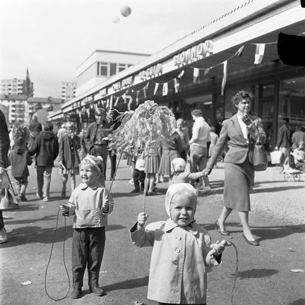Hässelby Gårds centrum invigs. Barn med pappersvippor i folkvimlet