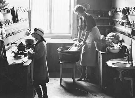 Bostad i folkskolan, Linnégatan 37. Kvinna sysselsatt med tvätt