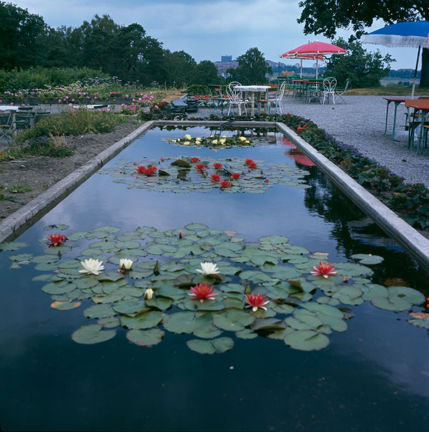Näckrosdammar mes röda, vita och gula näckrosor på Rosendals terrass. I fonden Gärdet