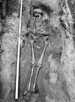 Utgrävning vid Klara Kyrka, kv. Orgelpipan. Skelett nr 23, fotograferat från öster