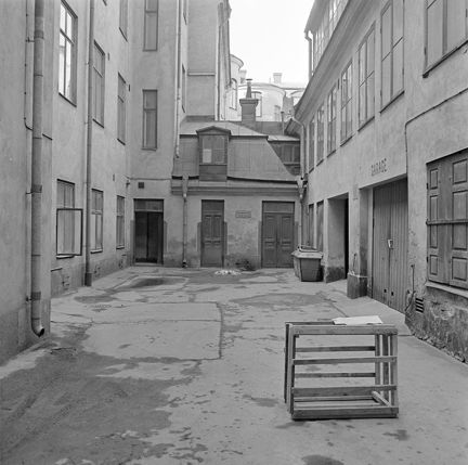 Herkulesgatan 24 innan rivning. Gården västerut, samt t.h. gårdshus längs norra tomtgränsen. Garage till höger