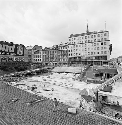 Sergels Torg under byggnad. Sett mot Drottninggatan 37-39 och ingången till T-Centralens tunnelbanestation.