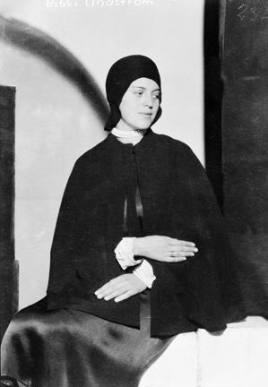 Porträtt av Bibbi Lindström, iklädd cape och hatt