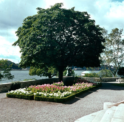 Prins Eugens Waldemarsudde. Slottsterrassen, med planteringar och rabatter. Vy mot Södermalm.