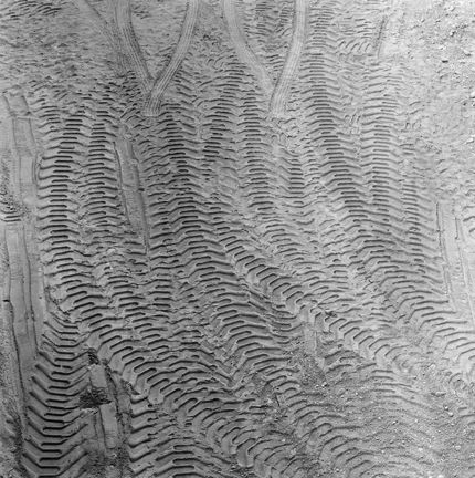 Hjulspår av schaktmaskin i rivningsgrop