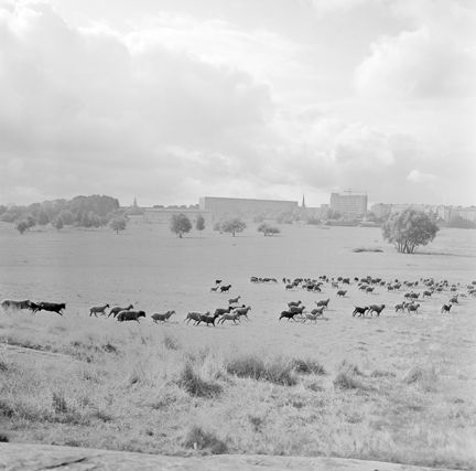 Kungens får på Gärdet. Vy västerut mot Radiohuset. Tornen på Oscars och Gustav Adolfs kyrka syns i fonden