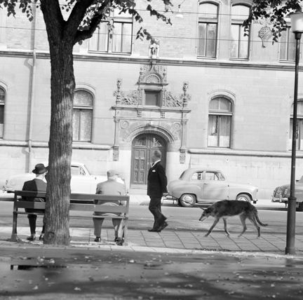 En man promenerar med hunden förbi Bünzowska huset, Strandvägen 29