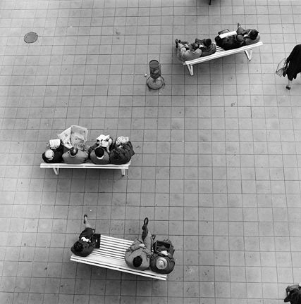 Tre parkbänkar med människor på Sergelgatan. Fågelperspektiv