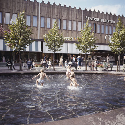 Badande barn i bassäng i Farsta centrum 1961