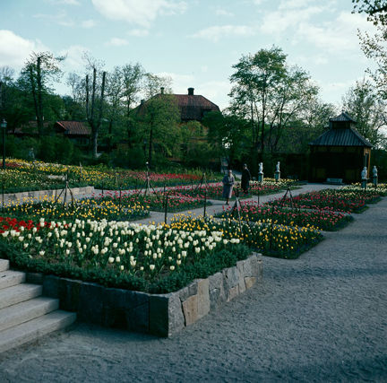 Skansen; planteringar vid Sagaliden. Vy åt söder. Swedenborgs lusthus närmast i fonden