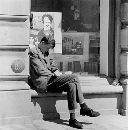 Ung man har nickat till i solen framför Bonnierbokhandelns skyltfönster. Sveavägen 56