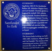 "Uppfördes 1883-85 för Stockholm Badhus AB. Arkitekter Magnus Isaac och Carl Sandahl. Glastäckt gårdsöverbyggnad för simhall 1903, arkitekt Sigge Cronstedt. Fasadens förebild är Palazzo Vendramin-Calergi i Venedig. Förhallen har inredning i renässansstil. Simhallen är inredd i jugendstil med fornnordiska och moriska inslag. 1985 återuppbyggdes simhallen efter en brand."