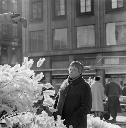 Påskrisförsäljning på Hötorget. Äldre dam med kappa och pälsmössa står invid det fjäderprydda riset