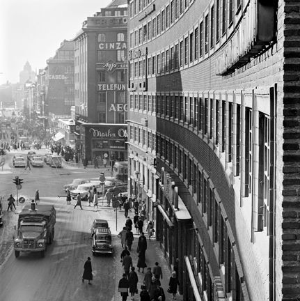 Kungsgatan västerut från kv. Oxhuvudet, vid korsningen Sveavägen. Till höger Centrumhusets fasad, Kungsgatan 32-38