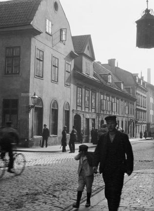 Regeringsgatan 54 A, B och C söderut från hörnet av Lästmakargatan. I folklivet står en polis med kask och sabel