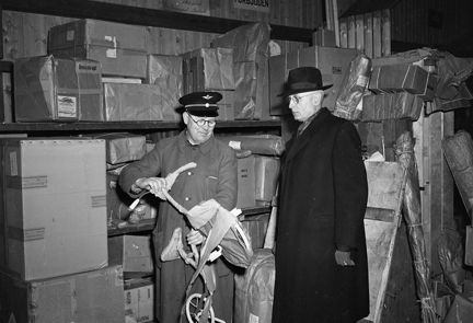 Julrusch på SJ:s godsutlämning. En paketerad barncykel hämtas ut