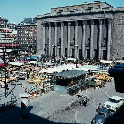 Hötorget. Vy från takterrassen ovanför Hötorgshallen mot Konserthuset. Grönsaksförsäljning på torget