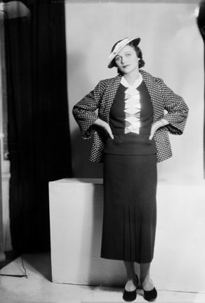 Porträtt av okänd modell, som visar kläder sydda vid Augusta Lundins modehus