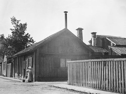 Västgötagatan 18 och 20 (nu Tjurbergsgatan 38) vid hörnet av Holländarevägen. En kvinna med ok fyller vatten i hinkar