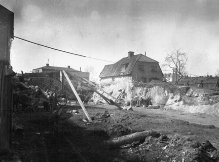 Sprängning för Wollmar Yxkullsgatans framdragning västerut mot Ringvägen. T.h. Wollmar Yxkullsgatan 26 och 28 i kv. Suggan som då låg mellan kv. Postiljonen och kv. Piskan. Nuvarande kv. Postiljonen