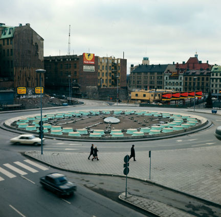 Vy från Stockholmsterrassen mot Sergels Torgsrondellen och rivningar i kv. Skansen och Fyrmörsaren