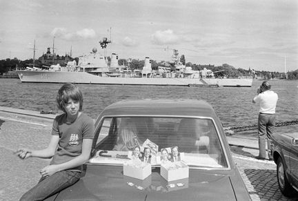 Reportage kring Kungabröllopet den 19 juni 1976. En pojke säljer nyckelringar med kungen och Silvias porträtt på Skeppsbrokajen. I bakgrunden ett militärfartyg på Strömmen