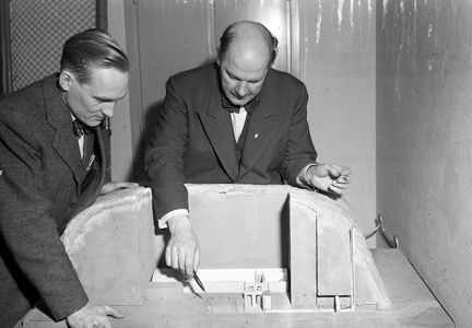 Kungsholmsgatan 30, Civilförsvarsbyrån. Ingenjörerna Edmén och Hollander studerar en modell av ett nytt skyddsrum