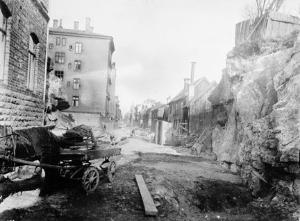 Maria Högbergsgata österut. T.v. Maria Högbergsgata 72 och 70 före Timmermansgatan. Berget sprängdes för Högbergsgatans framdragning genom kv. Bergsgruvan Större. Här ligger nu Högbergsterrassen
