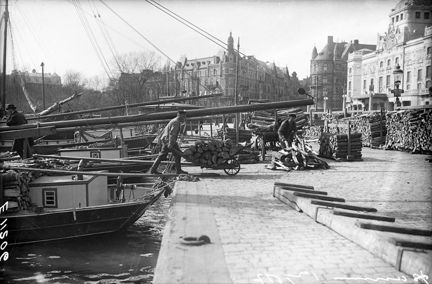 Nybrohamnen vid Strandvägen. Vårens första vedskutor lastas av
