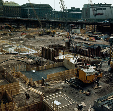Grund- och byggnadsarbeten i de utgrävda kvarteren Skansen och Frigga. Vy åt söder mot Vattugatan och Drottninggatan på stolpar