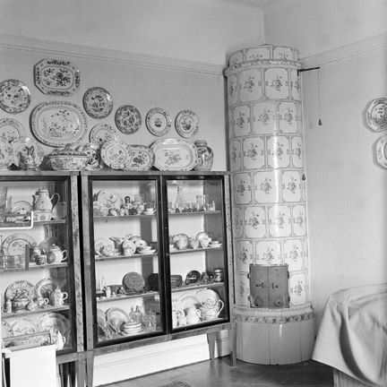 Strandvägen 49, 6 tr. Interiör med kakelugn och tallrikssamling